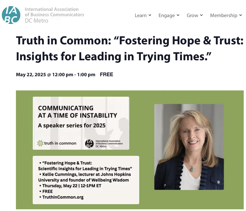 Webinar with IABC,DC and Truth in Common: Fostering Hope and Trust in Trying Times Jan 22 Written By Kellie Cummings Contact IABC|DC for access to this recording. Kellie Cummings